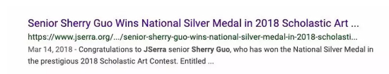 每日经济新闻(微信号:nbdnews)记者还发现,2018年3月14日,JSerra高中的官网上曾发布新闻稿称:Sherry Guo在2018年美国著名学术艺术比赛中获得全国银奖,然而,当记者打开这条链接时,发现信息已被替换。此外,Sherry Guo还被列为JSerra高中国家荣誉协会分会的国际学生干事。