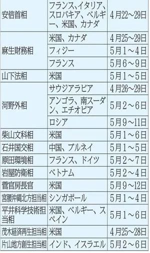 据共同社,日本政府高层官员似乎都不愿意浪费10天时间休息,有13人在这期间赴海外出差。首相安倍晋三22日至29日正在欧美6国访问。另外,财务大臣麻生太郎、外务大臣河野太郎、防卫大臣岩屋毅等12人均有出访行程。