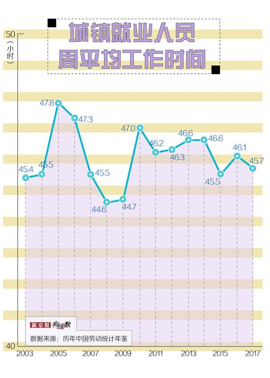 但事实上,我们都“违法”了。梳理历年《中国劳动统计年鉴》可以发现,近十几年来,中国城镇就业人员周平均工作时间,没有一年是低于 44 小时上限的。