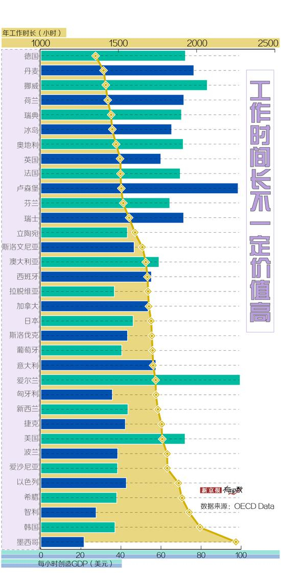 以 2017 年的数据为例,工作时间最短的德国、丹麦、挪威三国,每小时劳动所创造的 GDP 都要比工作时间最长的墨西哥、韩国、智利高很多。其中,全年工作时长为 1356 小时的德国,每小时劳动所创造的 GDP 为 72.2 美元,这是全年工作时长 2257 小时的墨西哥的 3.3 倍。