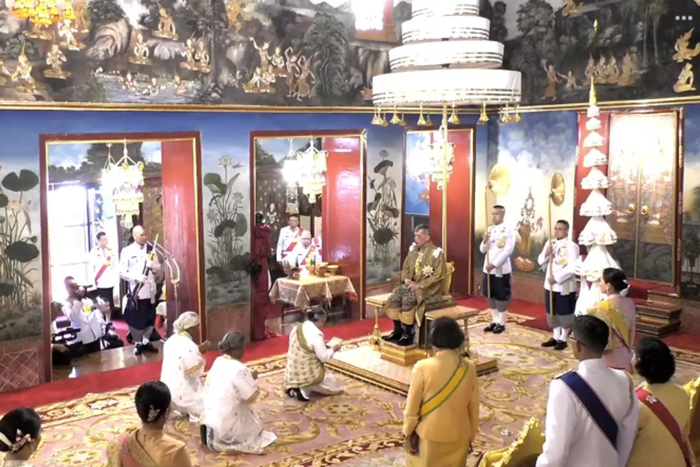 在经过圣水沐浴之后,泰王换上一件金袍和一条刺绣的裤子,坐上八角王座。包括泰国总理巴育在内的8位国家领导递上圣水,泰王接受涂油礼。
