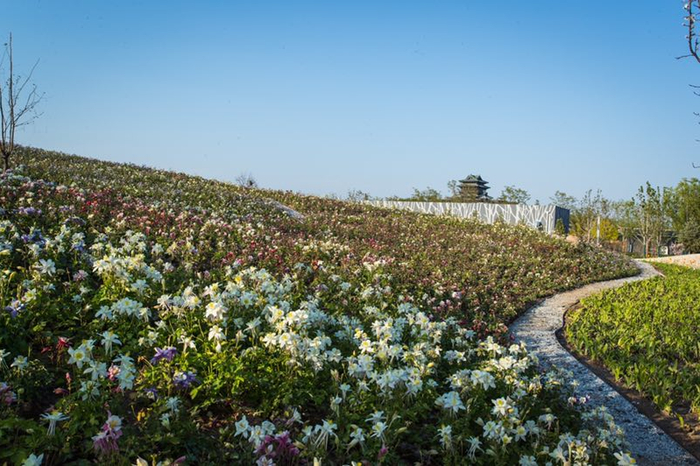 建设用地3.2万平方米的百草园,居于世园会场馆的西部,是最具特色的专业展园之一,在这里,约500种药用植物被集中展出。走进百草园,一条自西向东蜿蜒流转的水系贯穿全园,串联了32个主题景观,其中既有鲜花盛放的百草芊山,也有与中医文化结合的杏林春暖、四气五味等。