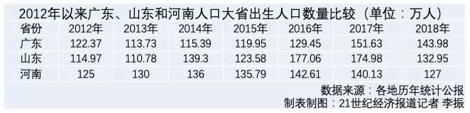 不过,“二胎大省”山东下降的势头更大,2018全年该省出生人口132.95万人,比2017年少了42万人。广东也由此取代山东,登上出生人口第一的位置。
