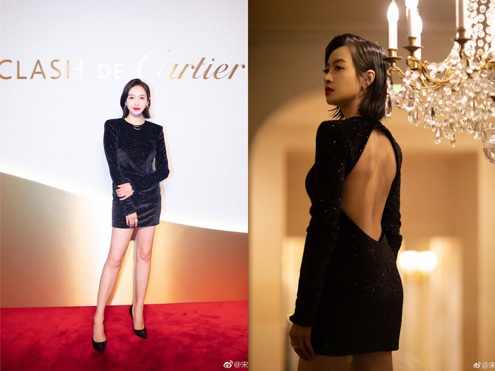 还有一种V形露背装是类似于宋茜穿的这种“倒V”。正面看起来是中规中矩的小黑裙,一转身,倒置的V形修饰出线条完美的肩膀,大面积露肤尽显好身材。
