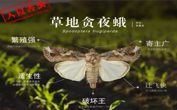 草地贪夜蛾俗称秋黏虫,食性杂,繁殖能力强,迁飞扩散快,原产美洲的热带和亚热带地区,是玉米上的重大迁飞性害虫,玉米苗期受害一般可减产10%-25%,严重危害田块可造成毁种绝收。2016年初,草地贪夜蛾首次被发现入侵非洲西部并暴发成灾,2018年在非洲造成的经济损失高达10亿-30亿美元。2018年7月,草地贪夜蛾首次传入亚洲地区。据农业农村部官网消息,今年1月,我国云南省首次发现草地贪夜蛾入侵危害。