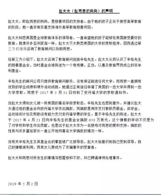 5月5日,赵涛之妻,当事人赵雨思之母通过律师发出声明,声明中称,女儿是事件的受害者,赵家是在得知女儿已被美国一所名校录取之后,在教育顾问建议下,才向斯坦福捐赠了650万善款。声明中称,“当有关辛格先生及其基金会的事宜被广泛报道后,赵太太始意识到自己受到误导,自己的慷慨被利用,而其女儿更成为了诈骗事件的受害者。”