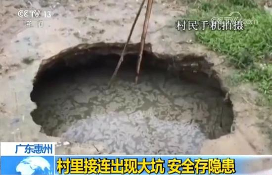 2018年11月起,广东省惠州市龙门县龙江镇罗洞村接连出现大坑,其中一些深不见底。记者赶到的时候,大部分的大坑都已经回填,但是一些没有被回填的坑里,因下雨积满了雨水。