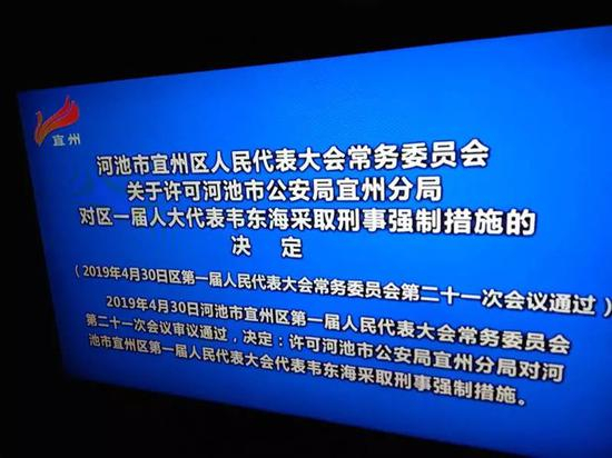 免职半个多月后,即4月30日,宜州区人大常委会第21次会议审议通过,决定:许可河池市公安局宜州分局对区人大代表韦东海采取刑事强制措施。