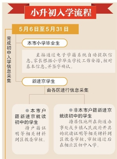 根据义务教育阶段入学安排,北京市小升初信息采集工作已经启动。5月9日开始,海淀区、丰台区等多区教委受理回户口所在区、回家庭实际居住地所在区初中入学申请、审核、登记工作。各区对于不同情况办理入学的方式、材料要求略有不同。例如,朝阳区办理跨区入学需提前网上预约,石景山各小学将对跨区就读申请进行初审。