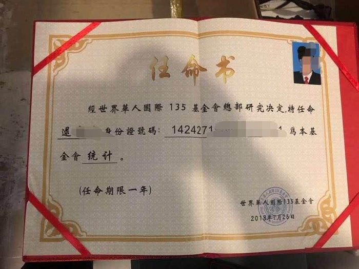 今年1月10日,上海杨浦警方获得一条线索,犯罪嫌疑人李某、王某、施某等人,建立多个微信群,通过虚构所谓的“世界华人国际135基金会是境外的“民族资产”,价值超过3000亿美金,吸纳6000名会员解冻资产后就能分到现金、汽车、住房,还能免费住进养老院养老等情节,诱惑中老年人交费入会。实际上,每位数千元的“会员费”及活动费经过层层转账,大部分都进了李某等人的腰包。