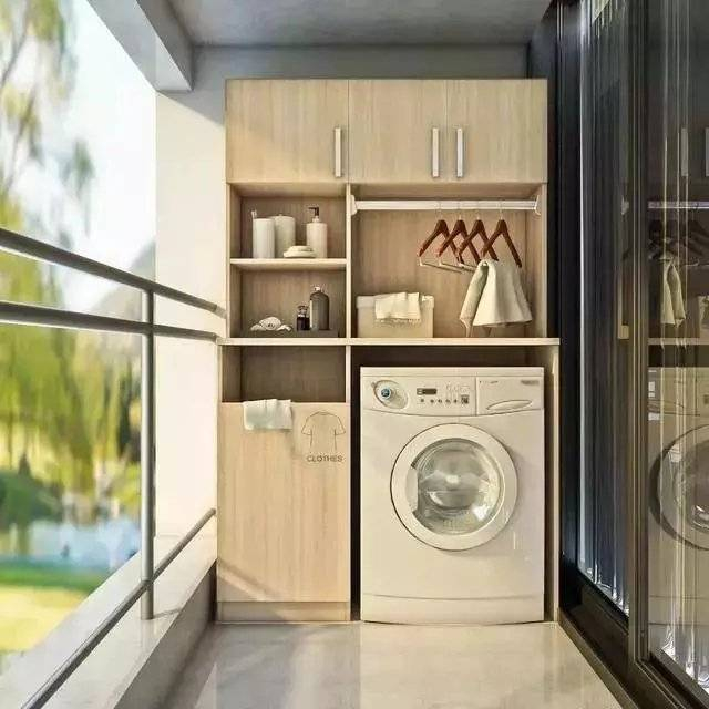 阳台变身洗衣房,在阳台靠墙的一侧加装橱柜,洗衣机可以嵌入橱柜中,不占用其他空间位置,而且洗衣液、消毒液等清洁用品可以直接放置在橱柜上,方便又整洁。同时,从洗衣机拿出衣物后就可直接在阳台上晾晒,不用端着一盆湿衣物在房间中穿梭。