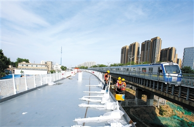 5月8日,记者来到自行车专用路施工现场,地点位于京藏高速西侧。在这里,自行车专用路紧贴地铁13号线,像一条钢铁巨龙横跨京藏高速。