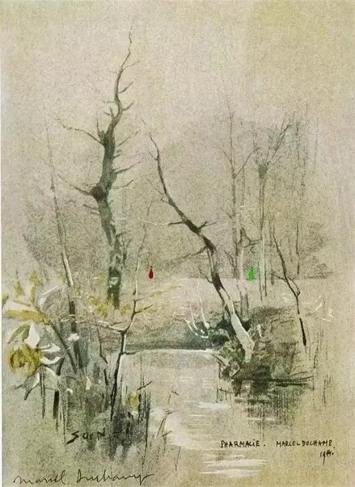 在作品《泉》之前,杜尚早已开始了他的现成品实验探索。1914年,杜尚从店里买来一幅风景画,在上面加上一红一绿两点后,署名《药房》(Pharmacie)。因为在法国,药店的橱窗里通常摆放着一红一绿两瓶药水,现成品代表着杜尚对权威的反抗。