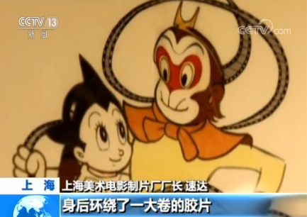 上海美术电影制片厂厂长 速达:1979年,日本的五大电影公司也是到美影厂来交流,随后美影厂的专家也去回访,跟日本的导演讨论这个中日的动画的艺术,那么在告别宴的时候,手冢治虫先生他就创作了一幅漫画,他的阿童木和我们中国的孙悟空并肩在一起,两个人手挽手大踏步的往前走,身后环绕了一大卷的电影胶片,表示中日动画友好的一个象征。