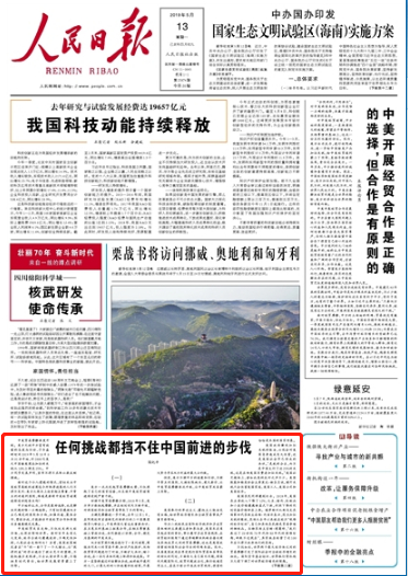 人民日报国纪平:任何挑战都挡不住中国前进的步伐