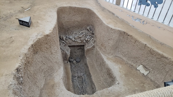 10座墓葬中,位于陈列馆西南角位置的墓葬最大,从上方俯瞰,呈现一个“凸”字状,研究人员也依次推测其身份、等级相对更高。其余9座大小相近,外形上也均为简单的长方形墓葬。