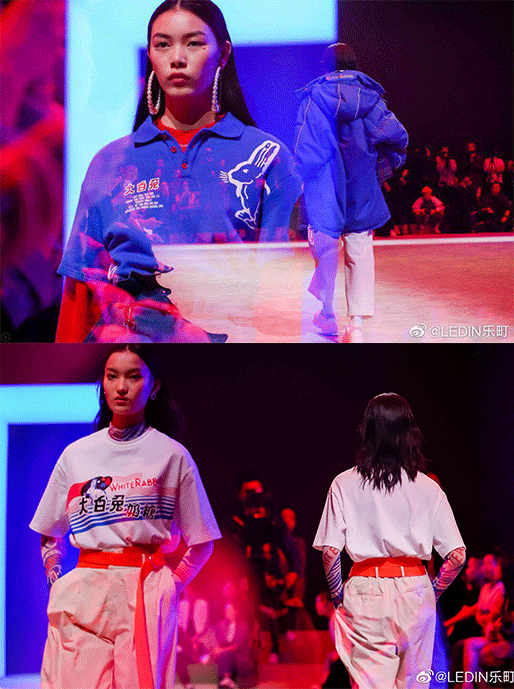 乐町(LEDIN)还和大IP“大白兔”联名,将本土消费者所熟悉的大白兔奶糖logo、“大白兔”品牌经典红白蓝三色运用到服饰设计上。让大秀的观众陷入怀旧的同时,也感受到一份儿时的纯粹的快乐。