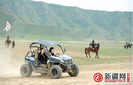 5月13日,在水磨沟区石人沟鸟巢阵景区附近,游客在体验越野全地形车。(记者陈岩摄)