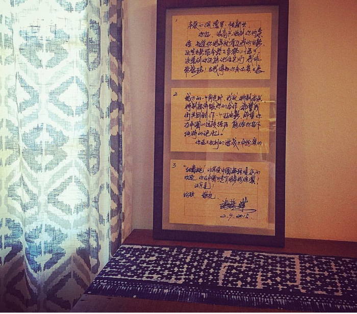 同年,他就获邀出演了电影《长城》。在得知消息后,佩德罗亲手给张艺谋写了封信,表示自己是他的影迷。而张艺谋在收到后,用中国传统的毛笔和黄纸写了一封回信,佩德罗将回信精心装裱在镜框里做成纪念品,并拍照发在了他的ins上。