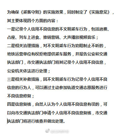 为维护轨道交通运营秩序,确保轨道交通运营安全,北京市交通委员会对《北京市轨道交通乘客守则》进行修订,同时,制订《关于对轨道交通不文明乘车行为记录个人信用不良信息的实施意见》,并于今日起正式发布实施。(文/北青报记者 刘珜)