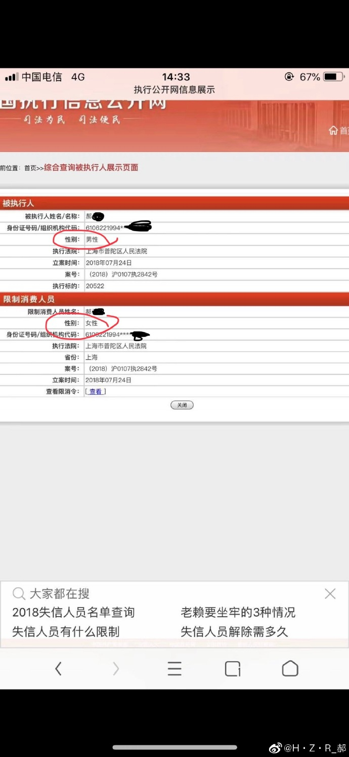 执行信息公开网截图显示,郝某所涉案件立案日期为2018年7月24日,被执行人显示为男性,但限制消费人员为女性,两个人都姓郝。