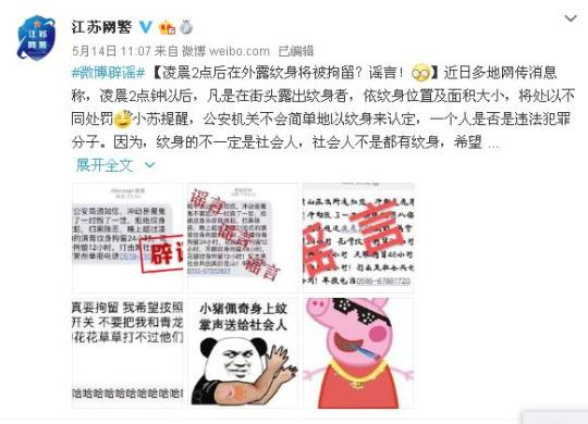凌晨2点后在街头露出纹身者将被拘?江苏警方:谣言