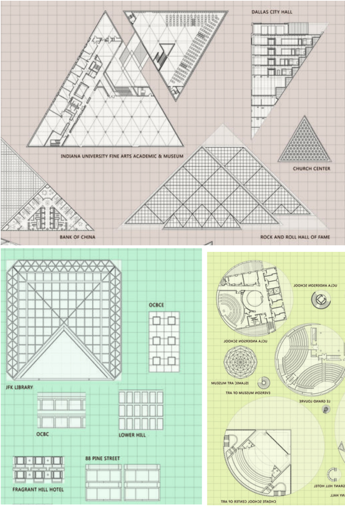 勒维特在作品中擅长运用三角、圆圈和方块这样的原始图形,而这些形状也是贝聿铭的建筑中最重要的形式元素。尽管贝聿铭的作品常常呈现出一个清晰有力的整体,但它们都可以被拆解成几组最为简单的几何形状。