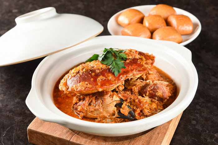 北京亮餐厅的菜单上则有一道保留菜,是辣椒珍宝大蟹配黄金小馒头。辣椒螃蟹可以说是新加坡最伟大的烹饪发明之一,据说这道世界名菜是1956 年一对经营手推车小吃的夫妇发明的。不过欧阳庆成采用独家秘方,加入蚝油、番茄酱和泰式甜辣酱制成的汤汁,令人垂涎。