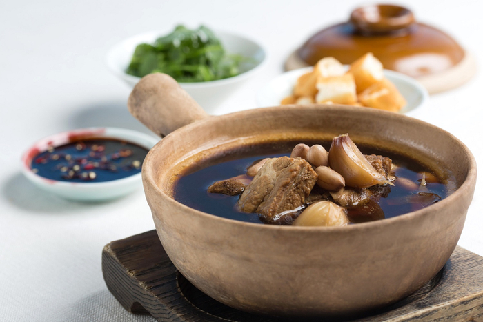 欧阳庆成介绍,这道肉骨茶在浓郁的茶汤中放入了当归、沙参、枸杞、玉竹、川芎、桂皮等温补食材,与骨胶原丰富的猪棒骨熬成的汤一起蒸一个半小时,汤中加入烤制后的白胡椒,提取辣味及鲜味。排骨则是带有软骨的肋排,口感饱满软嫩,煮熟后的肉骨汤色香味俱全,蘸以手工自制的酱油辣椒调料,最是慰藉。