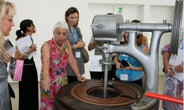 冰淇淋历史研究专家卢恰娜(中)向参观者介绍早期冰淇淋机器