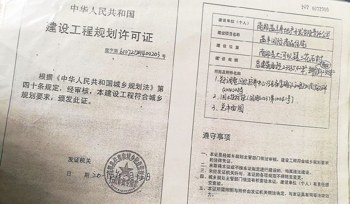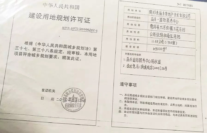中国房地产报记者调查发现,2010年5月31日,南郑县规划局颁发的建设用地[地字地610721201000202号]规划许可证显示,该项目用地单位为南郑益丰房地产开发有限责任公司;用地项目名称为“益丰国际·颐养中心”;用地性质为公用设施和居住用地。规划用地面积11.33公顷(170亩);总建设面积63000平方米。