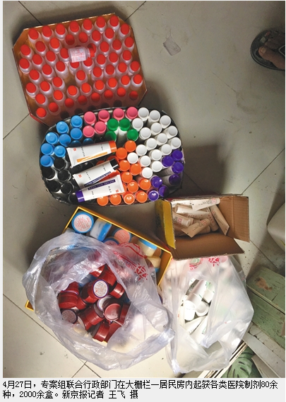 4月27日,海淀公安分局环食药旅中队会同中关村派出所,联合行政部门在西城区大栅栏一居民房内抓获犯罪嫌疑人任某英、李某钢,现场起获各类医院制剂80余种,2000余盒。