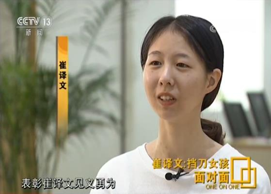 据CCTV-13《面对面》报道:为救同学挺身挡刀,有赞叹,有争议,20岁的崔译文是桂林电子科技大学大一的学生,事发当天为了保护同学,她的肝被刀捅穿,胆囊被刺伤,胸腔、腰腹、手臂各有道深深的口子,胸口到腹部还有一排破碎的伤痕,其中三刀贯穿。