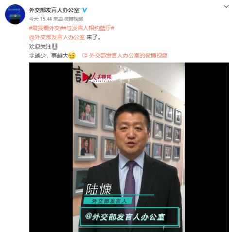 外交部新闻司司长兼外交部新闻发言人陆慷在视频中对网友说:“外交部发言人办公室”微博账号正式上线了,敬请大家关注!