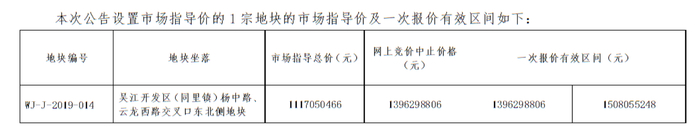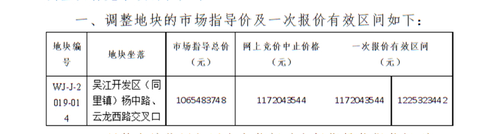 4月30日,这一地块的相关价格信息已有公布,根据《苏州市吴江区国有建设用地使用权网上挂牌出让公告(吴地网挂[2019]7号)》,该地块的市场指导总价约为11.17亿元,网上竞价中止价格约为13.96亿元,一次报价有效区间为13.96亿元~15.08亿元,而根据《补充公告》,这三个价格分别调整为10.65亿元、11.72亿元及11.72亿元~12.25亿元,对比来看分别下降了4.62%、16.06%及18.75%。