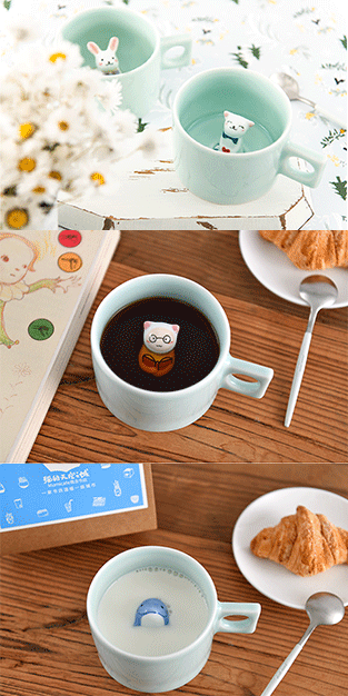 萌系的物件大概都有一种神奇的魔力,大部分人都抵挡不住这份可爱。这款创意水杯也是一个美妙的存在,水杯中间有可爱的陶瓷小动物,包括小猫、海豚、秋田犬等,当你往杯中加水之后,小动物的头就会露出来,好像它们在水中游泳一般,非常有趣。
