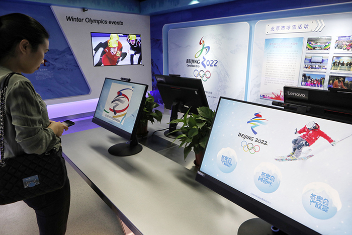 社区居民在冬奥文化展示区参观。