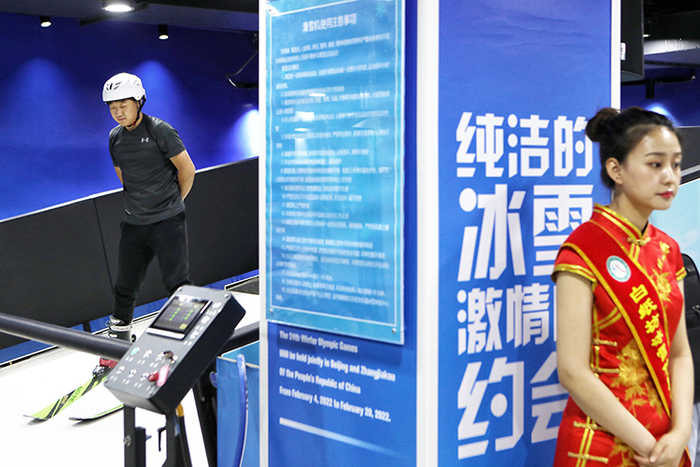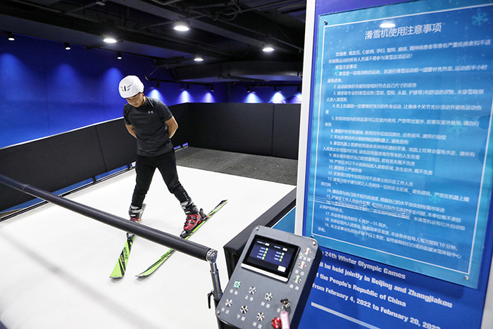 冰雪体验中心内,社区居民体验滑雪机。