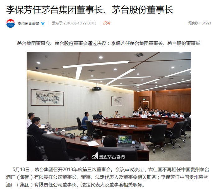 2018年5月6日晚间,中共贵州省委常委、组织部长李邑飞在茅台集团组织召开干部大会,宣布省委决定:提名茅台集团党委书记、总经理李保芳为茅台集团董事长人选,董事长职务任免需按有关法律程序办理。袁仁国不再担任茅台集团董事长职务。