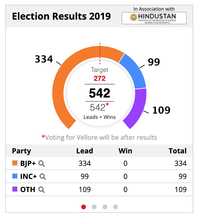 今日印度统计结果显示,在542个人民院议席中,莫迪所在的人民党领导的全国民主联盟获得334个席位。《印度时报》统计结果则显示,全国民主联盟获得325个席位。两个统计结果都远超赢得大选所需的272个席位。