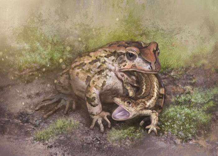 格尼蛙吞食诺敏螈生态复原图。图源:邢立达