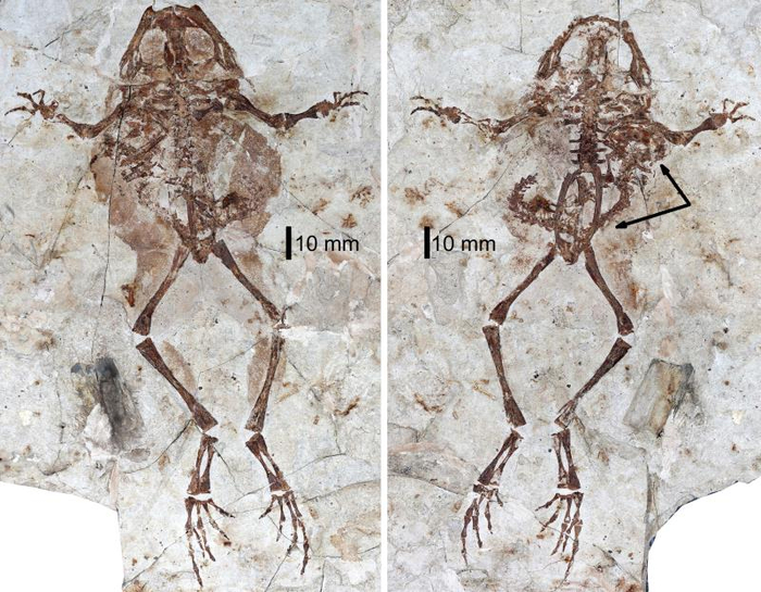 此次胃容物的主人是距今1.2亿的格尼蛙(Genibatrachus),它身体长度约7.5厘米,头骨长2.4厘米,整体保存非常精美,可以清楚地看到每侧上颌骨都有大约50个排列紧密的小牙齿,而其保存良好的身体软组织轮廓描绘了一只硕壮的蛙类:身体宽大,厚实,大腿肌肉强壮。