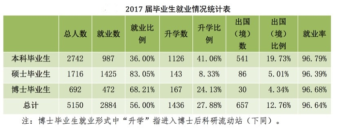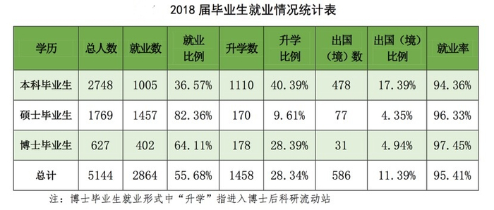 《中国农业大学2018年毕业生就业质量报告》显示,中国农业大学2018届毕业生共5144人,其中本科毕业生2748人,1005人毕业后参加工作,就业比例达到36.57%。而当届毕业生升学数则为1110人(升学比例40.39%),以微弱优势高于就业人数。此外,另有478位毕业生选择毕业后出国。