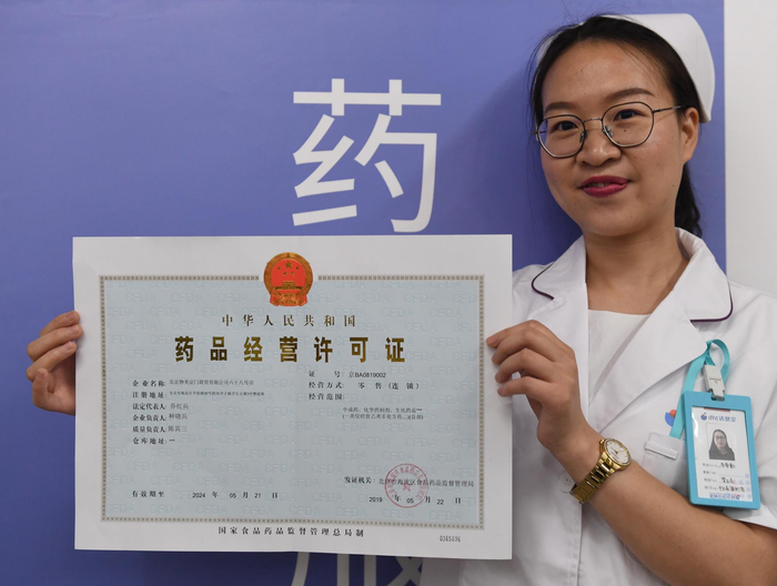 工作人员展示《药品经营许可证》。摄影/新京报记者 吴宁