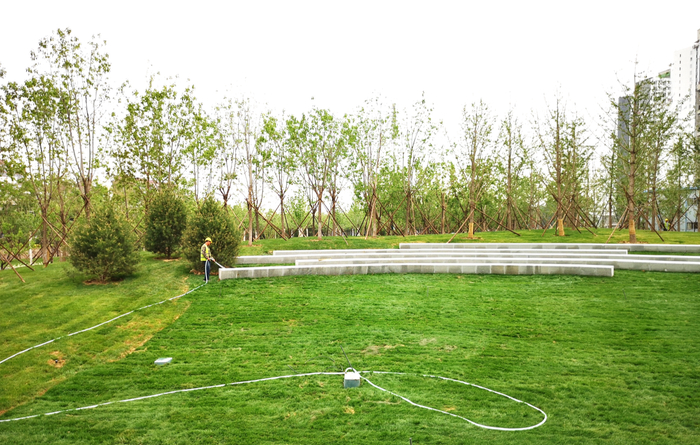 工作人员正在给草地浇水。摄影/新京报记者 黄哲程