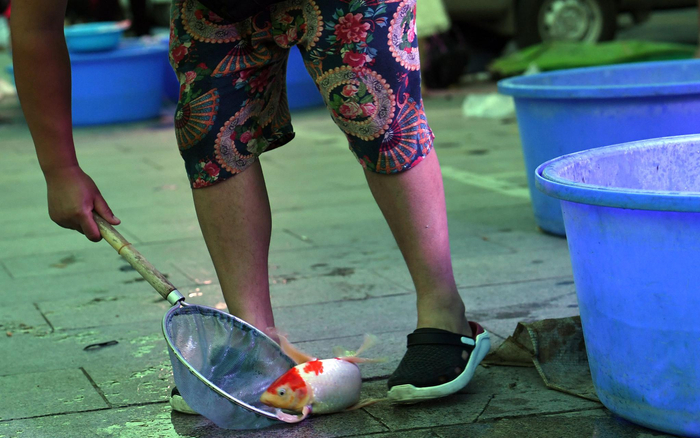 一条鲤鱼跳出了鱼盆,商贩赶忙将“越狱”的鲤鱼捞回去。新京报记者 王颖 摄