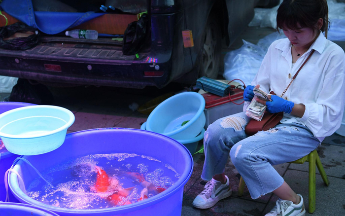 在各种灯光照明下,一辆辆小面包车有序地排列着,地上摆满了各色的塑料袋,里面装的是不同品种的观赏鱼,锦鲤、金鱼,红、金、黑、黑红相间、红白相间,等待着顾客挑选。