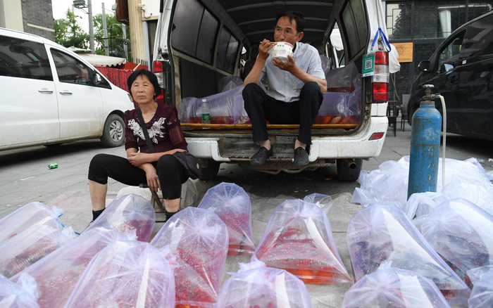 商贩边吃晚餐边卖鱼。新京报记者 王颖 摄