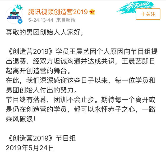 新京报讯(记者 武芝)5月24日,《创造营2019》官博发文宣布王晨艺退赛,称“《创造营2019》学员王晨艺因个人原因向节目组提出退赛,经双方坦诚沟通并达成共识,王晨艺即日起离开创造营的舞台。”