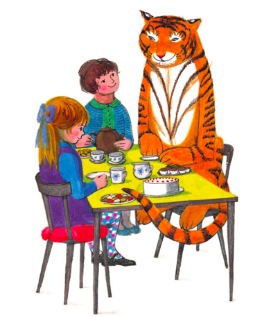 在结婚以后,朱迪斯·克尔成为了一名全职妈妈,有两个小孩。“真的很无聊,”她后来回忆道,“我们去散步,喝茶,真的是这样。我们希望有人能来。所以我想,为什么不让老虎来呢?”她开始给女儿讲这个故事。然后,在她45岁的时候,她和她的孩子在学校里一起画出了适合的画,去掉了任何不重要的背景,这样老虎、孩子和一些家具就从一张白纸上脱颖而出。《老虎来喝下午茶》讲述了老虎到主人公家里大吃大喝,连她爸爸的啤酒都被喝光的故事,简单而有趣。 老虎,一个友好而不凶猛的动物,把原本可能是极度不安的经历——一只野生动物入侵一个小小的家庭厨房——变成了一个有点令人惊讶又好玩的故事。